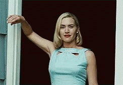 Kate Winslet, in a light blue dress, stands in a doorway and waves goodbye with a friendly smile.