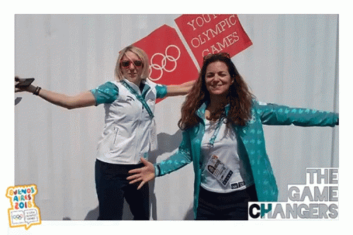 Two women energetically wave dancing and jumping at the Buenos Aires 2018 Youth Olympic Games.