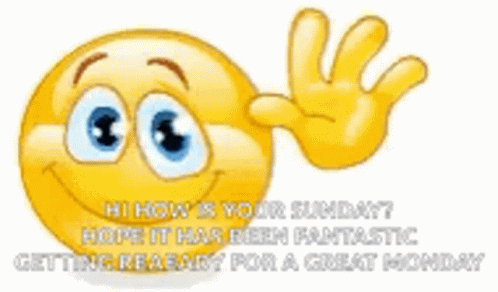 A cheerful waving emoji with a friendly message about Sunday and getting ready for a great Monday.