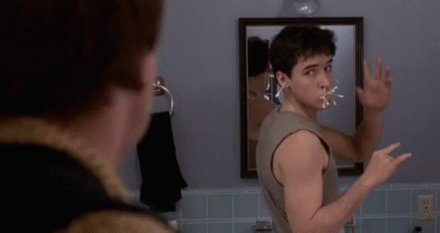 John Cusack as the 'Wave Weirdo', standing in front of a mirror and smoking a cigarette.