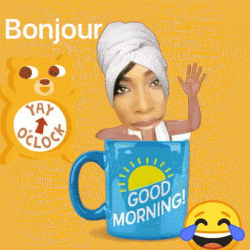 Jayjay and Bahonon animated greeting with a waving figure, 'Good Morning' mug, and 'Yay O'Clock' bear.
