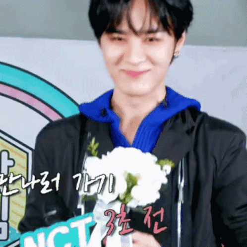 WayV's Kun smiles warmly while holding a large bouquet of white flowers, with Korean text visible on screen.
