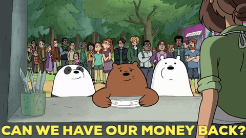 Grizzly, Panda, and Ice Bear from We Bare Bears ask for their money back at a counter.
