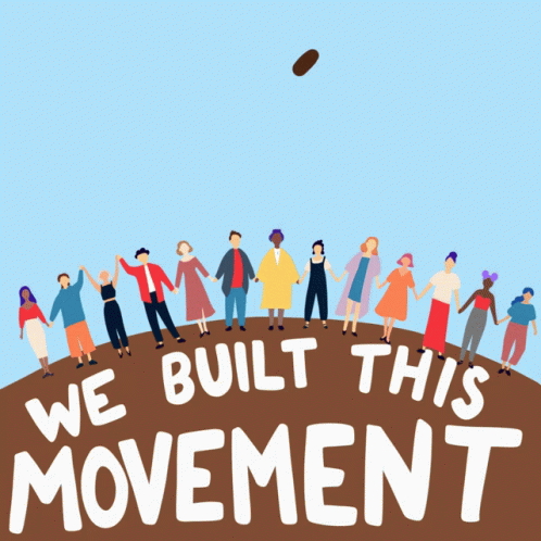Animated graphic showing diverse people supporting 'We Built This Movement' for immigration, healthcare, reproductive rights, and climate change.