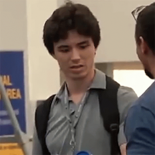 A man with dark hair and a backpack explains a situation by stating, 'We have a policy.'