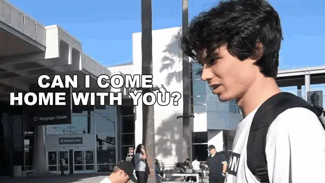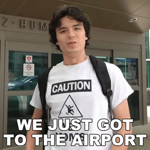 A young man, Lofe, wearing a 'CAUTION' t-shirt, announces his arrival at the airport.