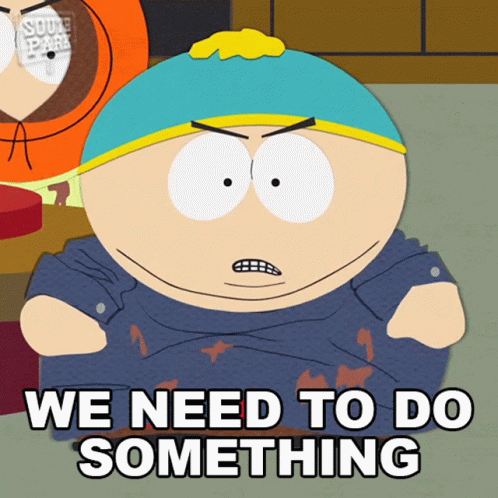 Eric Cartman from South Park emphatically states, "We need to do something!" with an angry expression.