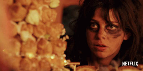 A disheveled woman from Daybreak eats a pastry, with the text 'WE NEED TO EAT SOMETHING' displayed.