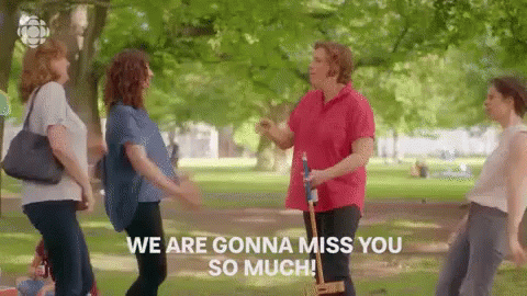Group of women in a park sharing an emotional farewell, with one woman holding a stick, expressing "WE ARE GONNA MISS YOU SO MUCH!".