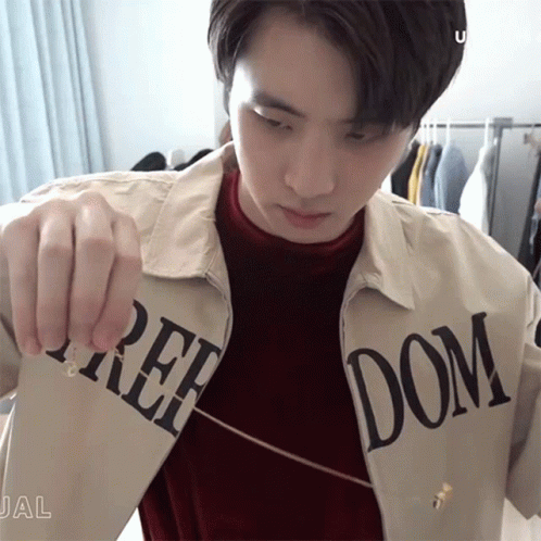 Ultimate Troop member adjusts his gold necklace, wearing a 'FREEDOM' jacket and red turtleneck.