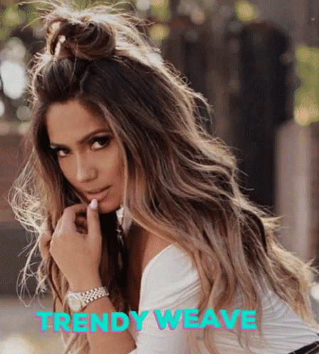 A woman showcases a stylish blonde, wavy bob haircut, highlighted by the text "TRENDY WEAVE" on screen.