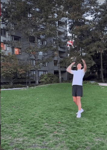 Michael plays volleyball with a friend in the park for Wechat We Chat.