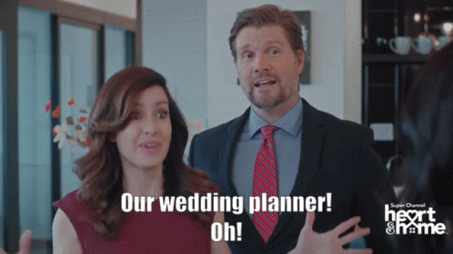 A couple reacts with surprise and excitement to the reveal of their wedding planner.