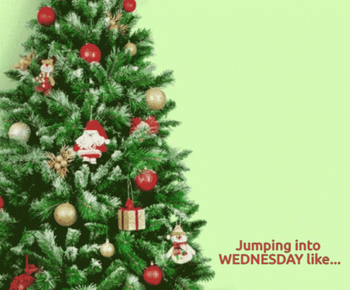 A playful cat leaps towards a decorated Christmas tree, embodying the 'Jumping into Wednesday like...' meme.