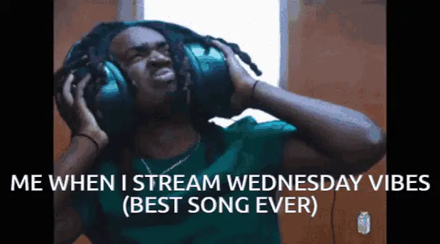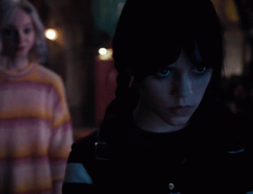 Wednesday Addams, with her signature dark pigtails, turns to look at the camera with a serious expression.