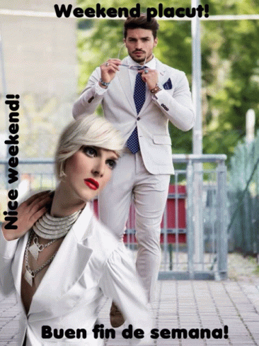 A stylish man in a white suit and a woman in a white blazer wish viewers a nice weekend in multiple languages.