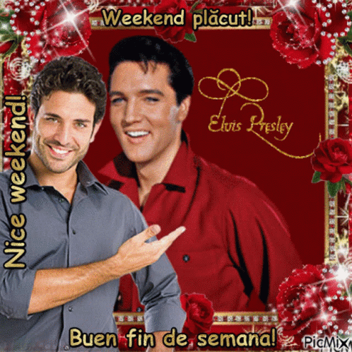 Elvis Presley and another man share warm weekend greetings with text in multiple languages.