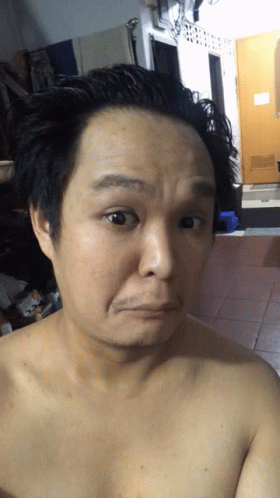 Chino makes a funny, exaggerated face while shirtless indoors, looking off to the side with a playful demeanor.