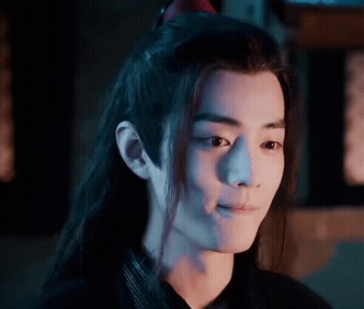 Wei Wuxian (Wei Ying) making a cute, shy face, seemingly holding back a laugh.