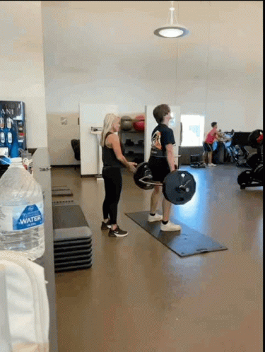 A man performs deadlifts in a gym with the assistance of a woman, focusing on proper form during his weight lifting session.