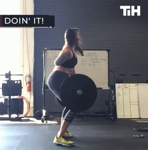 A woman confidently performs a weightlifting exercise with a barbell in a gym, showcasing her strength.