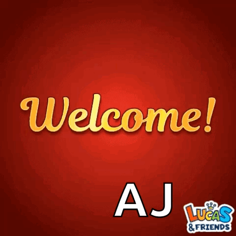A vibrant red background with the golden text 'Welcome!' and 'AJ', featuring stars and the 'Lucas & Friends' logo.