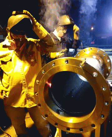 Two workers in protective gear perform industrial welding on a large pipe, creating bright sparks in a dark setting.