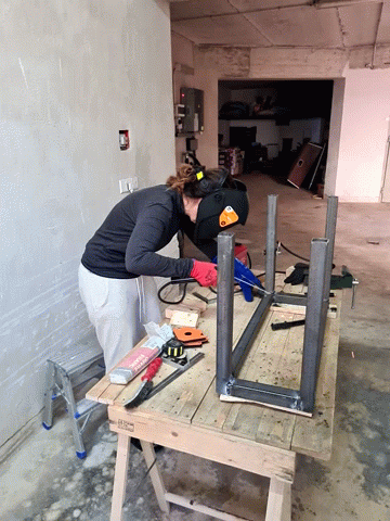 A woman wearing a welding mask is actively working on a metal frame on a wooden workbench.