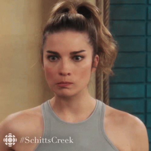 Alexis Rose (Annie Murphy) looks surprised and concerned in this moment from Schitt's Creek.