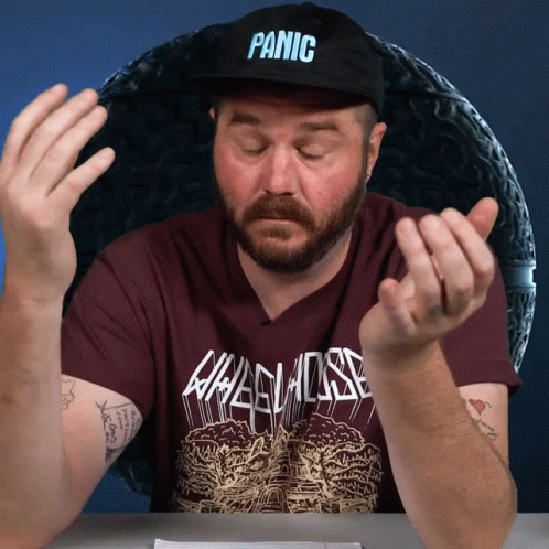 James Pumphrey from Donut Media shrugging and gesturing with his hands, wearing a 'Panic' hat and 'Wheelhouse' t-shirt.