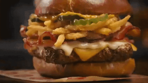 Close-up of a delicious Wendy's Pretzel Pub Bacon Cheeseburger with bacon, cheese, pickles, and fries.