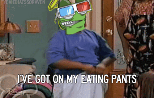 A cartoon character with 3D glasses, possibly Wengoods Gorg, says "I've got on my eating pants" in a meme.