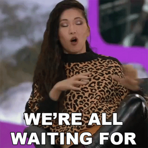 Mari Takahashi, wearing a leopard print sweater, sits on a couch and says "We're all waiting for."