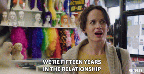 Elizabeth Reaser as Andi discusses being fifteen years into a relationship, standing in a colorful wig store.