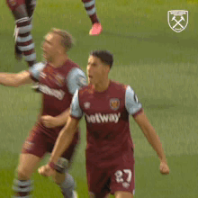 Nayef Aguerd of West Ham United celebrates on the field with a teammate, showing excitement after a play.
