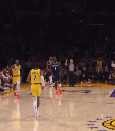 Russell Westbrook and Lonnie Walker IV celebrate on the court during a Lakers game.