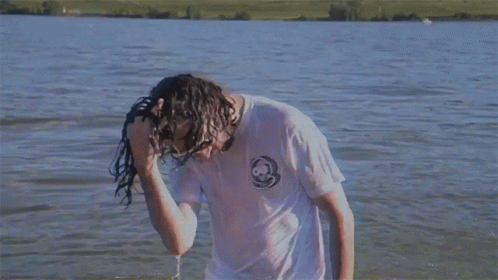 A person from Spacestation Gaming (ssg) cools off in a lake, shaking wet hair and creating a splash.