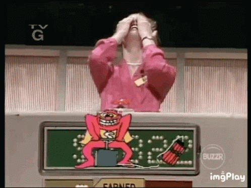 A contestant reacts with shock and then a forced smile after a Whammy appears on Press Your Luck.