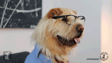 A clever dog from Pet Collective wears glasses and a blue shirt, looking intelligent and funny.