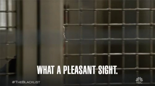 Raymond Reddington from The Blacklist smiles behind bars, with the caption 'WHAT A PLEASANT SIGHT.'