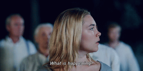 Florence Pugh looks confused, asking 'What is happening?' in front of a group of people.