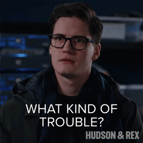 Jesse Mills, looking concerned, asks 'What kind of trouble?' in a scene from Hudson & Rex.