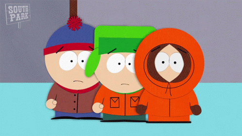 Stan Marsh, Kyle Broflovski, and Kenny McCormick from South Park look shocked and confused.