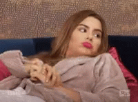 A woman in a cozy robe lies on a couch, making an expressive and somewhat dramatic facial reaction.