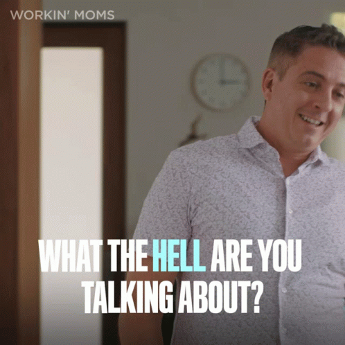 Lionel from Workin' Moms reacts with confusion, asking 'What the hell are you talking about?'
