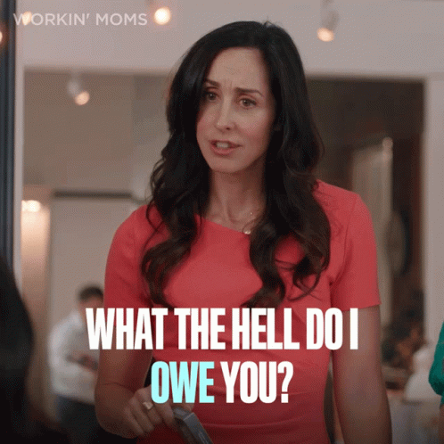 Kate Foster from Workin' Moms asks 'What the hell do I owe you?' in a dramatic moment.