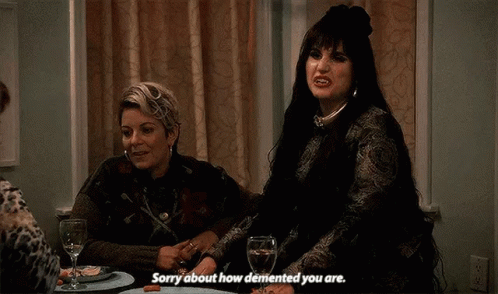 Nadja (Natasia Demetriou) delivers a sharp line, "Sorry about how demented you are," at a dinner table.