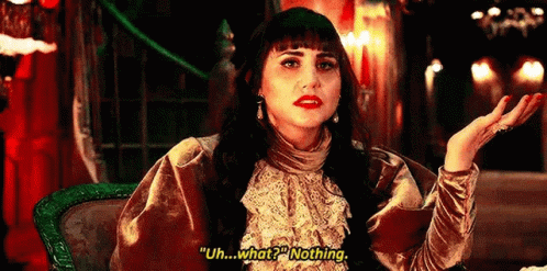 Natasia Demetriou as Nadja from What We Do In The Shadows, making a dismissive gesture while saying "Uh... what?"