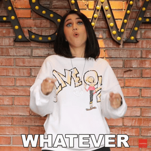 Aida Saskia makes a 'whatever' gesture, pointing her fingers while wearing a white sweatshirt with a graphic design.