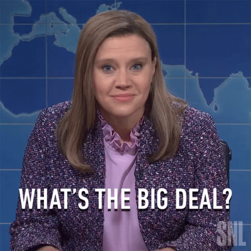 Kate McKinnon on Saturday Night Live, asking "What's the big deal?" from a news desk set.